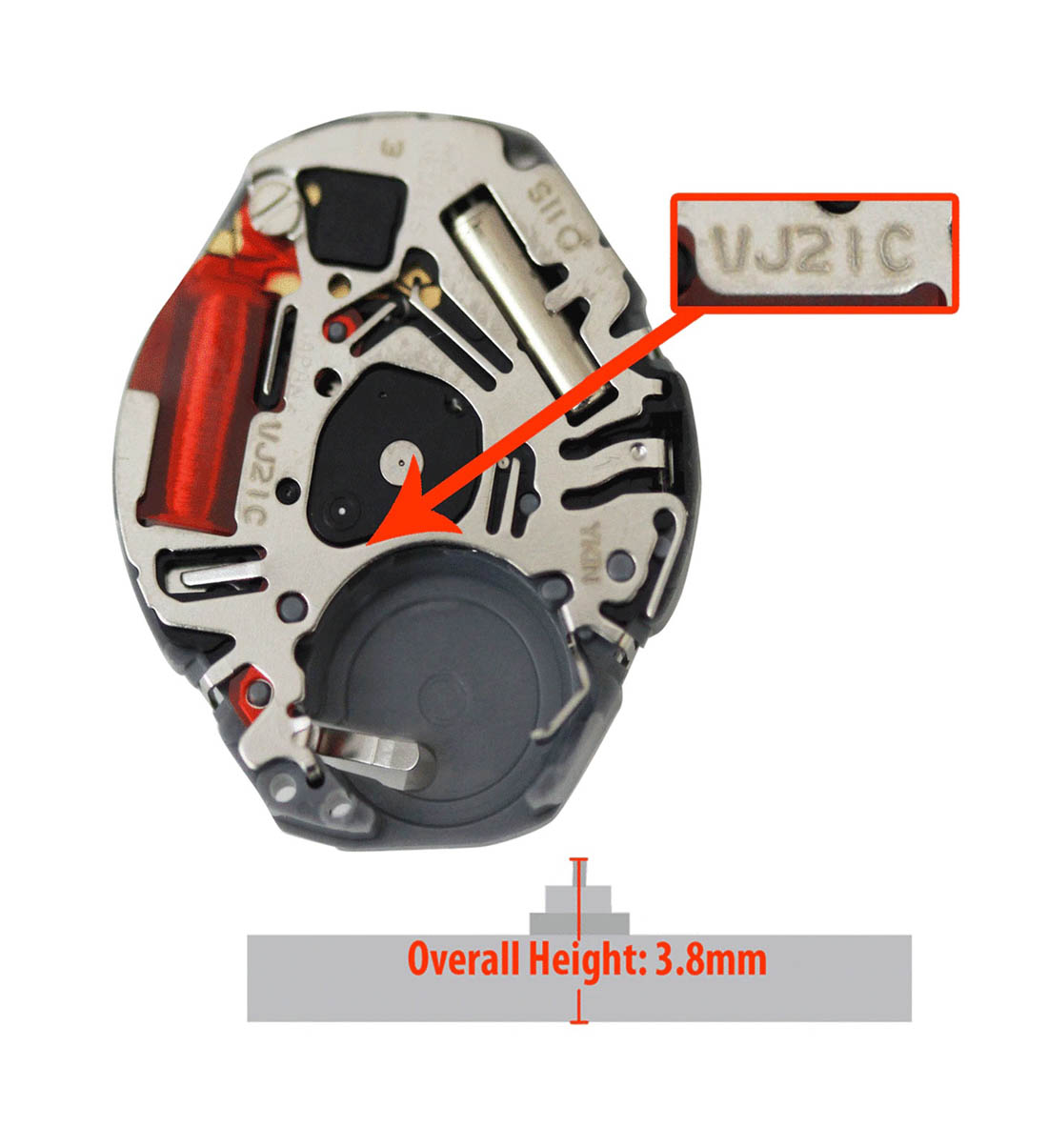 Ketinggian dari bagian bawah mesin jam tangan ke atas pinion kedua sapuan adalah 3,8 mm